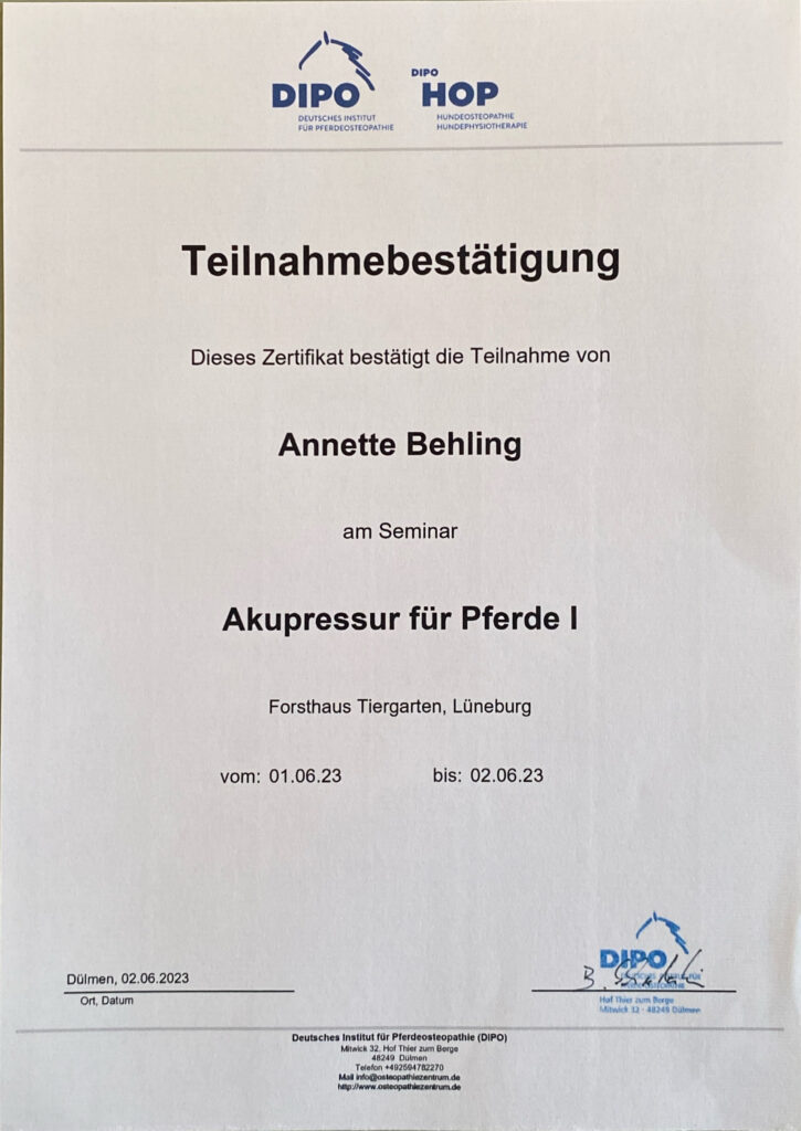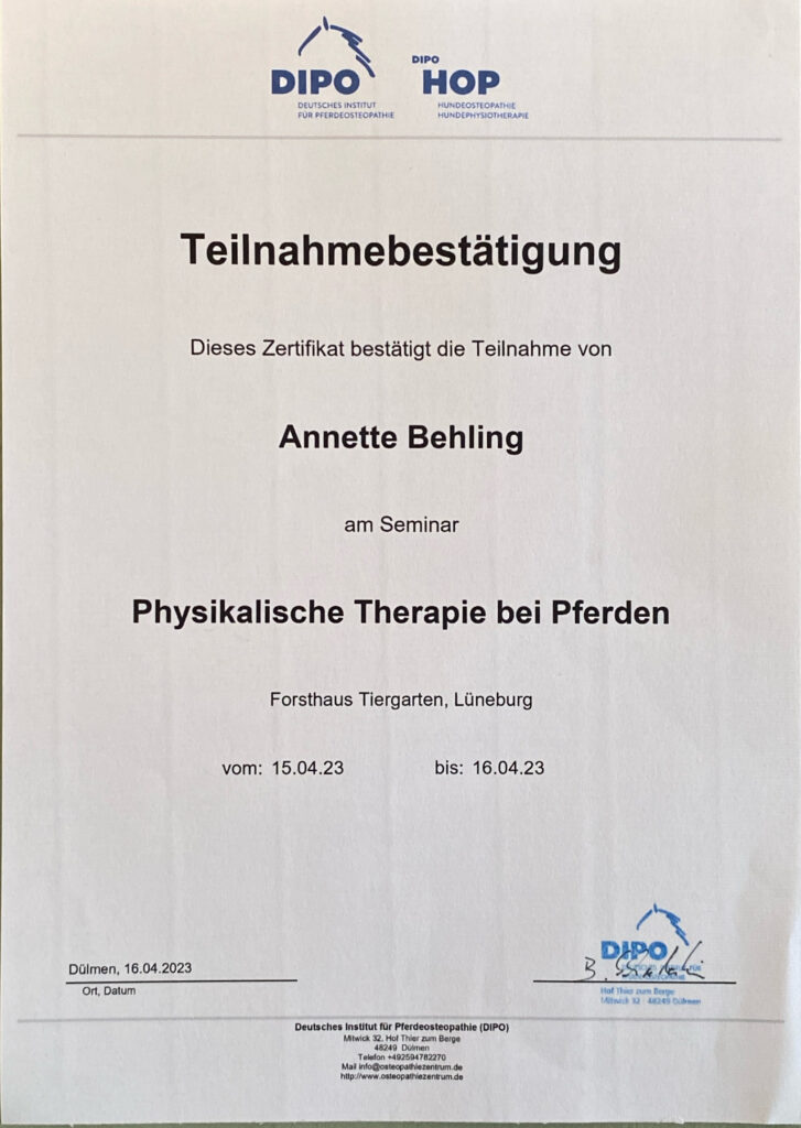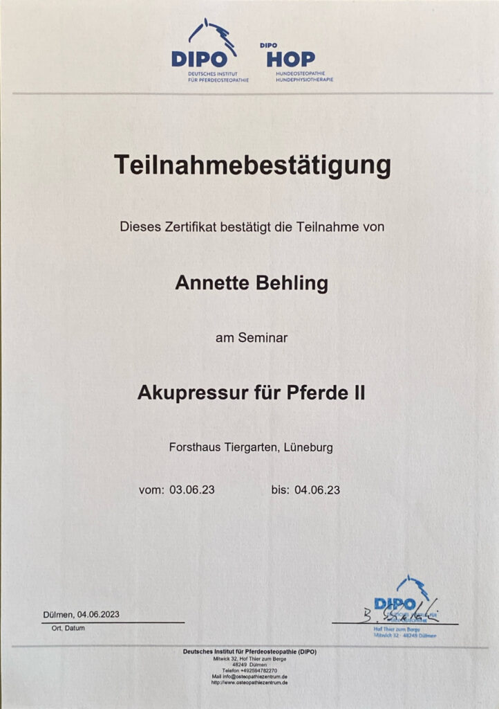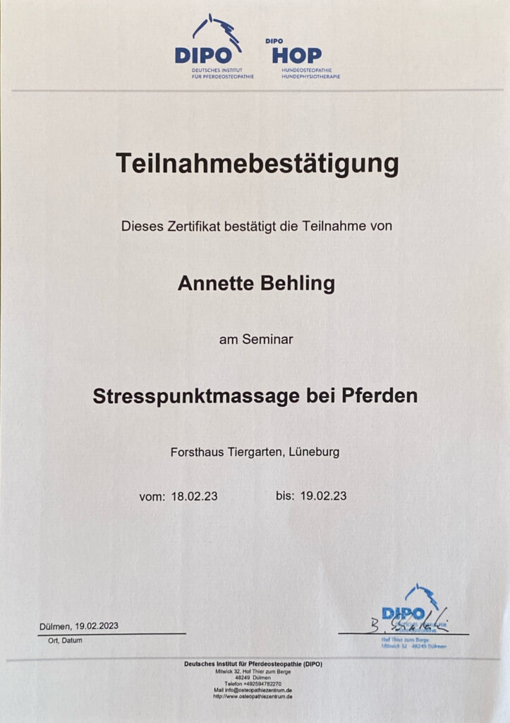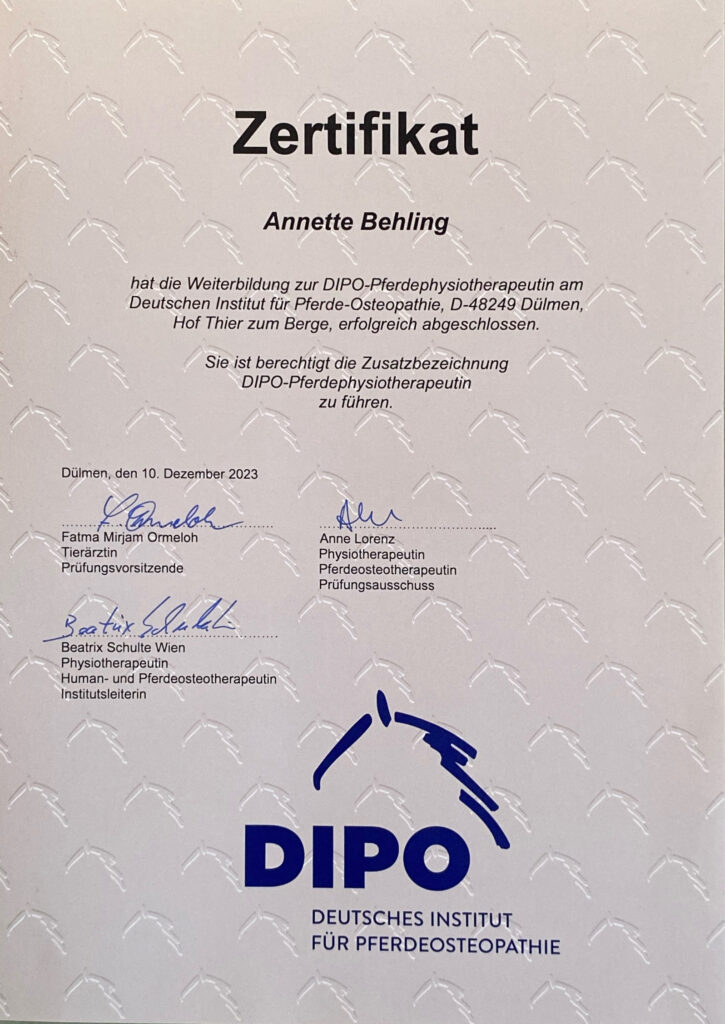 Parallel entwickelte sich meine berufliche Ausrichtung zunehmend in Richtung der Pferdegesundheit und somit bin ich seit 2009 im osteopathischen Bereich tätig. Aus zunächst vereinzelten Behandlungen im privaten Umfeld entwickelte sich eine Nachfrage, die mich dazu motivierte, meine Qualifikation systematisch zu erweitern. Heute arbeite ich hauptberuflich mit Pferden und Ponys aller Sparten und Leistungsklassen.